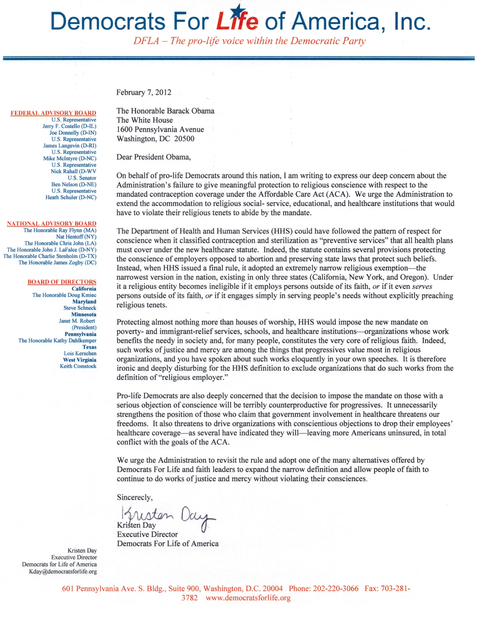 In the meantime, as another resource and part of the record, here is a letter to the President on Tuesday from Kristen Day of Democrats for Life (see also statement here), which argues that